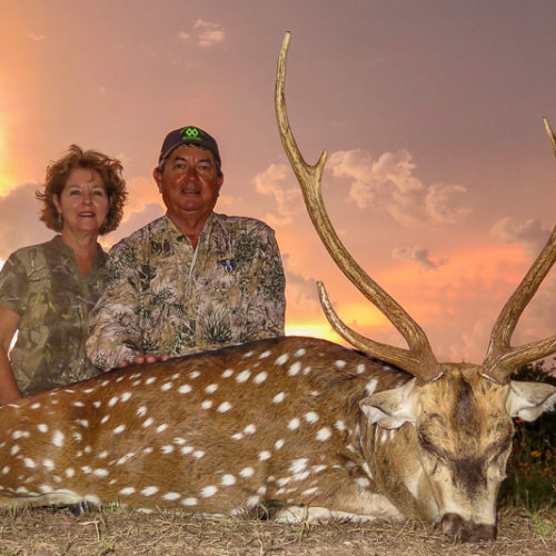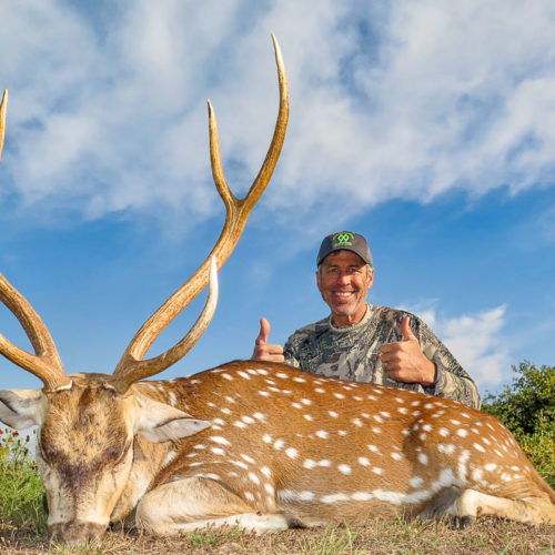 Axis deer are one of the most common exotic species hunted in Texas, and if you’re looking for a giant axis deer hunt you have come to the right place! I hunt axis deer on several different ranches, but my ranch with the best axis deer hunting is 3600 acres in Real County. This ranch has some of the biggest axis deer I’ve ever seen and with 400-500 axis deer on the ranch, you will see numerous giant bucks to choose from while axis deer hunting.